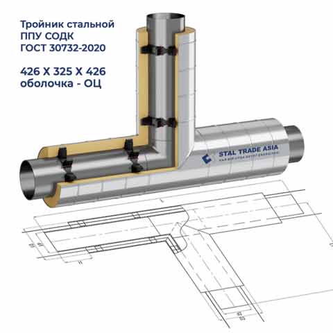 Тройниковое ответвление Ст. 426-325-426-1-ППУ-ОЦ — это фасонный элемент, используемый для ответвления потока в трубопроводных системах. Применяется для монтажа надземных трубопроводов, где требуется надёжная защита от коррозии и механических воздействий. Конструкция включает стальные трубы, слой пенополиуретановой (ППУ) изоляции и оцинкованную (ОЦ) внешнюю оболочку, что обеспечивает долговечность, прочность и устойчивость к внешним факторам.
